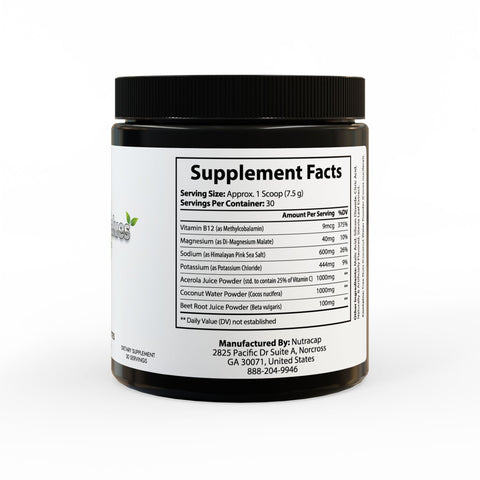 Key ingredients include Vitamin B12, Magnesium, Sodium (as Himalayan Pink Sea Salt), Potassium, Acerola Juice Powder (standardized to contain 25% Vitamin C), Coconut Water Powder, and Beet Root Juice Powder.