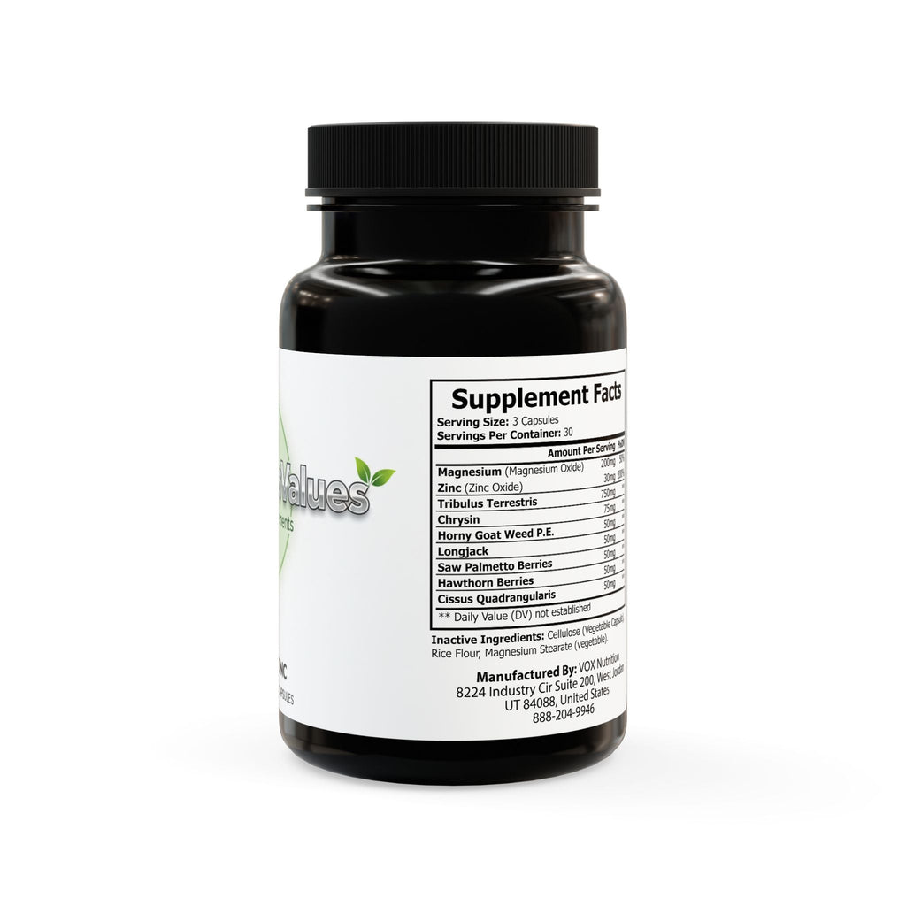 Ingredients: Magnesium (Magnesium Oxide), Zinc (Zinc Oxide), Tribulus Terrestris, Chrysin, Horny Goat Weed P.E., Longjack, Saw Palmetto Berries, Hawthorn Berries, Cissus Quadrangularis. Inactive Ingredients: Cellulose (Vegetable Capsule), Rice Flour, Magnesium Stearate (vegetable).