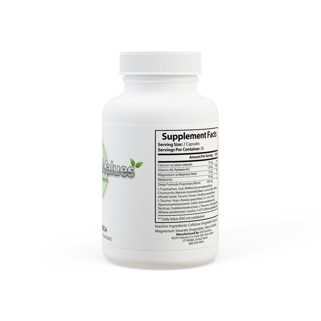 Ingredients: Calcium (as Calcium Carbonate), Vitamin B6 (Pyridoxine HCL), Magnesium (as Magnesium Citrate), Melatonin, Sleep Formula Proprietary Blend: L-Tryptophan, Goji (Wolfberry)(Lycium barbarum)(berry), Chamomile (Matricaria chamomilla)(ower), Lemon Balm (Melissa